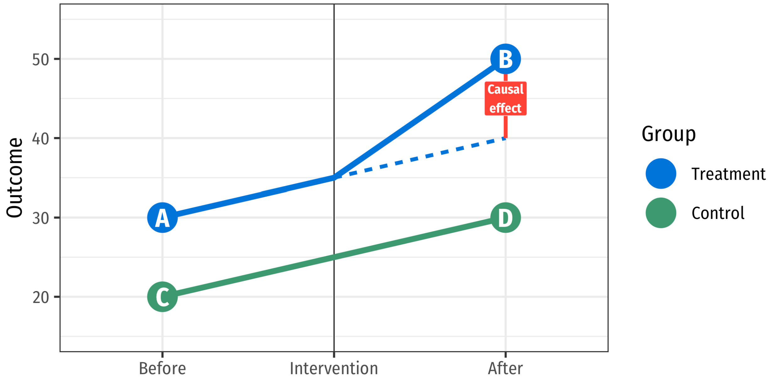 \[ \widehat{ATE} = \underbrace{[\text{Mean}(B) - \text{Mean}(A)]}_\text{Difference} - \underbrace{[\text{Mean}(D) - \text{Mean}(C)]}_\text{Difference} \]